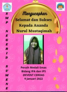 Mengawali tahun 2022 ananda Nurul Mustaqimah mempersembahkan 2 Medali Emas sekaligus di bidang IPA dan IPS. Keberhasilannya ini semakin melengkapi apa yang sudah dicapai sebelumnya dengan catatan raihan 1 Medali Perak bidang IPS dan 3 Medali Perunggu bidang IPS.